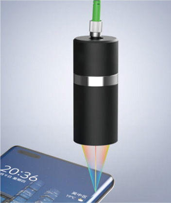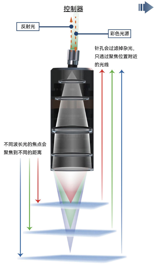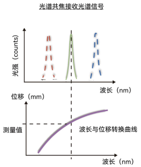 白色点光源通过色散共焦探头后照射到目标上,光源中不同波长成分形成纵向分布;目标上的光点通过共轴光路返回后通过小孔光阑,接入到光谱仪中。当与目标的距离产生变化时,聚焦的光线的波长也会随之变化,在光谱仪中产生不同的光谱分布。